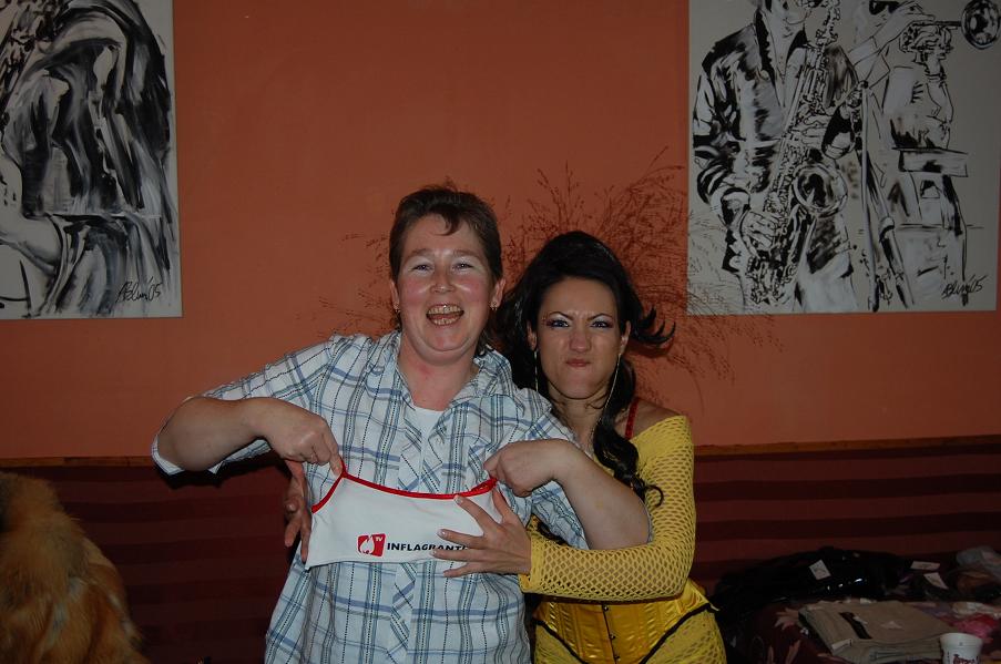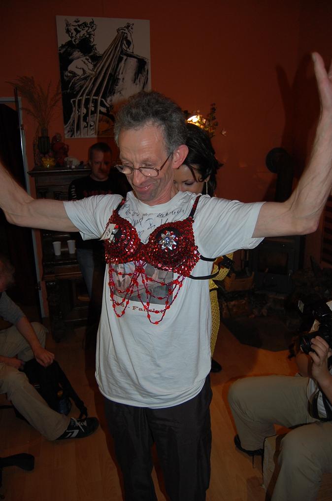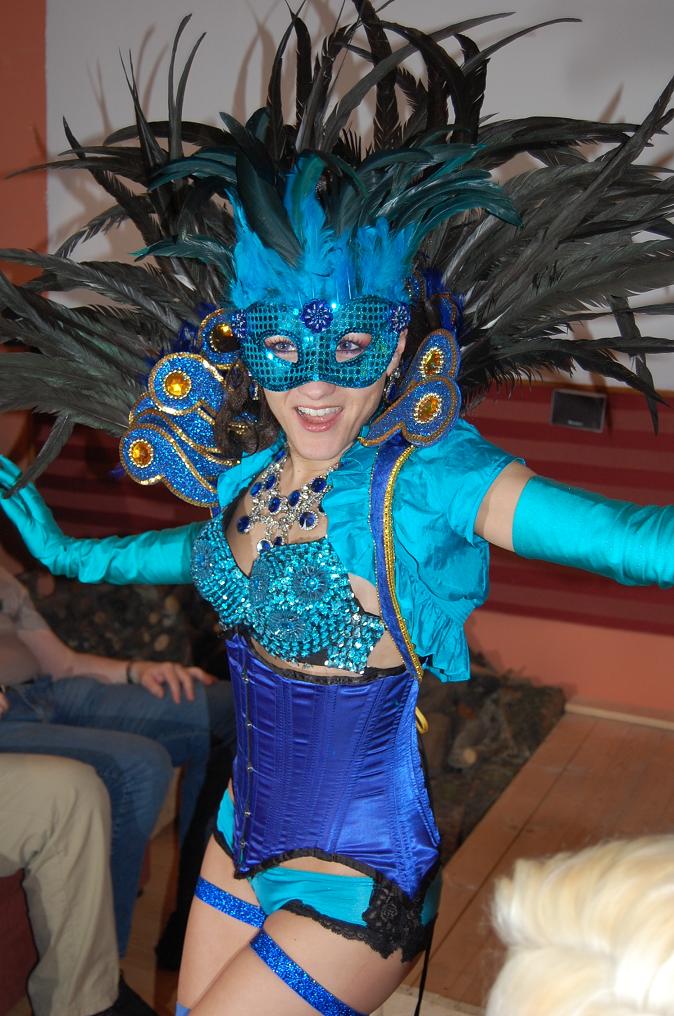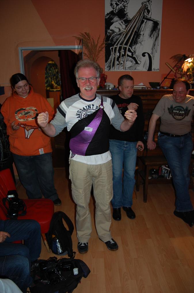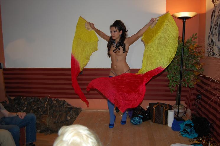 Schickes Leckerlie des Fanclubtreffens war, so denke ich zumindest, meine Bühnenshow. Das blaue Kostüm hatte ich extra für Brigitte angezogen, da sie es bislang nur von Bildern kannte und dieser Liveshow schon lange entgegenfieberte. Leider fiel während der Show öfter mal die Musik für einige Sekunden aus, daher gings nicht -wie gewohnt- flockig zur Sache und meine Show stolperte ein wenig. Einige Requisiten, wie meinen Leuchtstab z. B., gabs dann zum Trost und als Andenken.