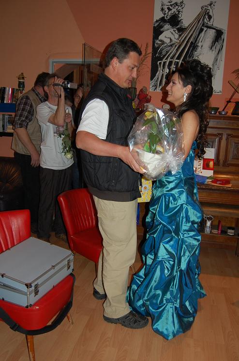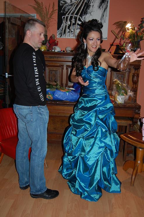 Rüdiger und seine (und meine) liebe Frau Brigitte holten mich Punkt 12:00 Uhr aus dem heimischen Gefilde ab, und schon gings los zur Location. Nachdem wir gut eine Stunde an den Eventvorbereitungen feilten, öffneten sich die Tore und die ersten Fanclubtreffengäste betraten das Lokal. Nachdem sich alle eingefunden hatten, startete das Treffen mit einer herzlichen Begrüßung. Auf Wunsch zog ich noch einmal mein Galakleid der Venus-Award-Verleihung 2011 an und sorgte damit wohl für anfangs recht festliche Stimmung.