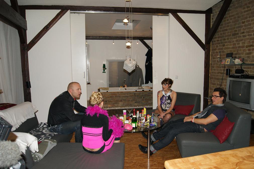 Punkt 23:00 Uhr gingen wir dann über die Joachimstaler Strasse zum „Q-Dorf“. Tatkräftig gestützt von Brigitte und Chrissy, stöckelte ich über den Asphalt: Der Grund dafür, meine neuen goldenen Schuhe brachten mich fast um (aber hübsch sehen sie aus, nicht wahr!?).