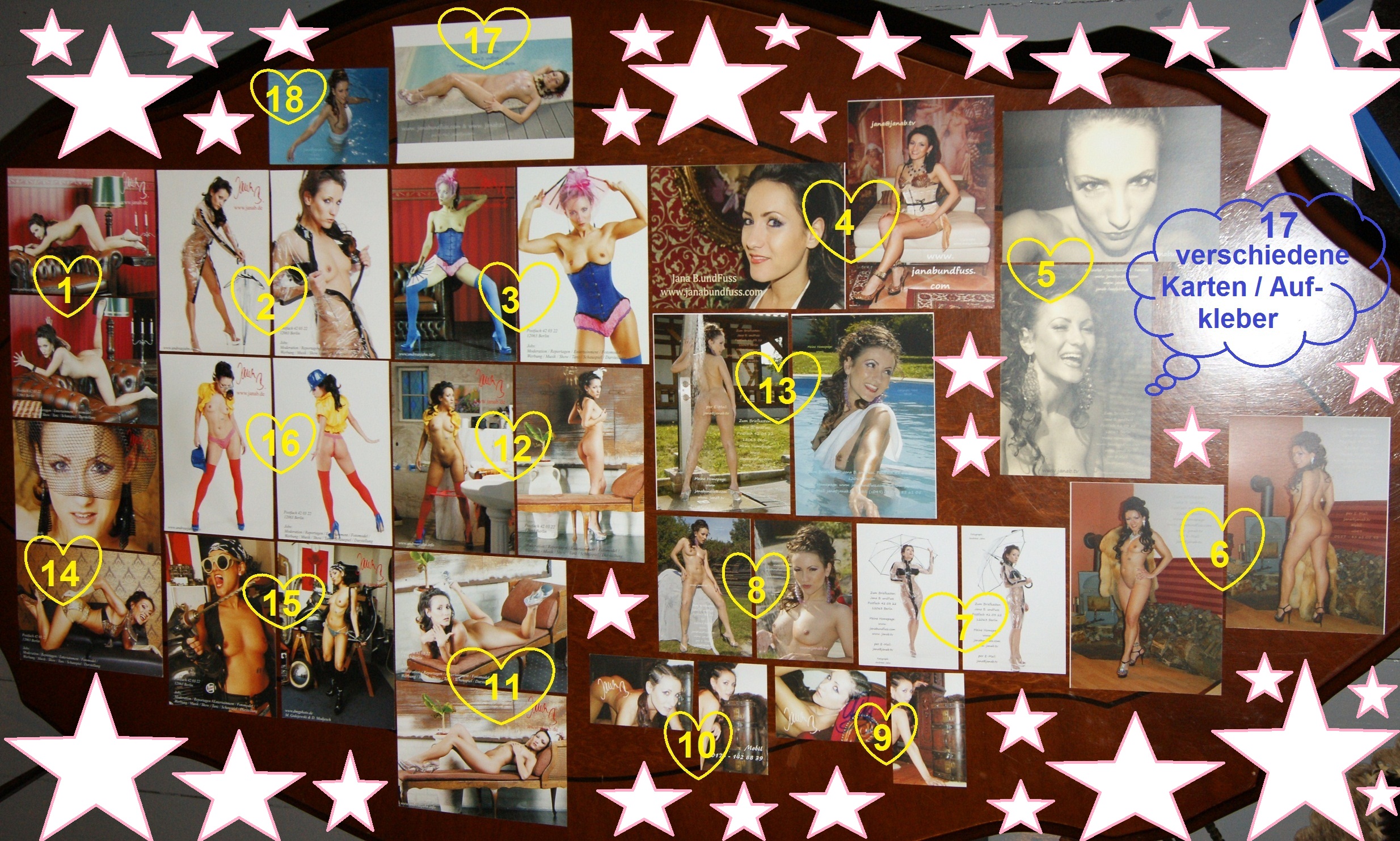 Auf dem Foto seht Ihr all meine Autogrammkarten die nach den Jahren der Jana Bach-Ära von mir selbst in den Druck gegeben wurden. Gern möchte ich nun, dass Ihr mir schreibt, welche Jana B.undFuss-Autogrammkarte Euch bislang am Besten gefällt. Die Autogrammkarten sind beidseitig bedruckt, die Aufkleber nur vorn. Nachschub ist selbstverständlich garantiert, denn alle paar Wochen kommen weitere neue Karten/Fotoaufkleber für die Fans und die Fanpost an den Start. Wählt also einfach die Nummer Eurer Lieblingskarte und schreibt mir im Blog einen kleinen Kommentar dazu.